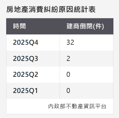 房市降溫後,房地產糾紛開始出現異常訊號,根據內政部不動產資訊平台最新資料顯示,2025年全台房地產交易糾紛中,「建商倒閉」案件在第四季出現異常暴增,過去幾年房市熱絡的台南市,單季就出現32件,與前三季全台僅2件相比,短時間內暴衝數十倍,成為市場高度關注的警訊。專家指出,建商倒閉糾紛通常是房市景氣轉折時的「前哨指標」,若市場資金壓力持續升高,未來不排除其他區域也可能出現類似情況。